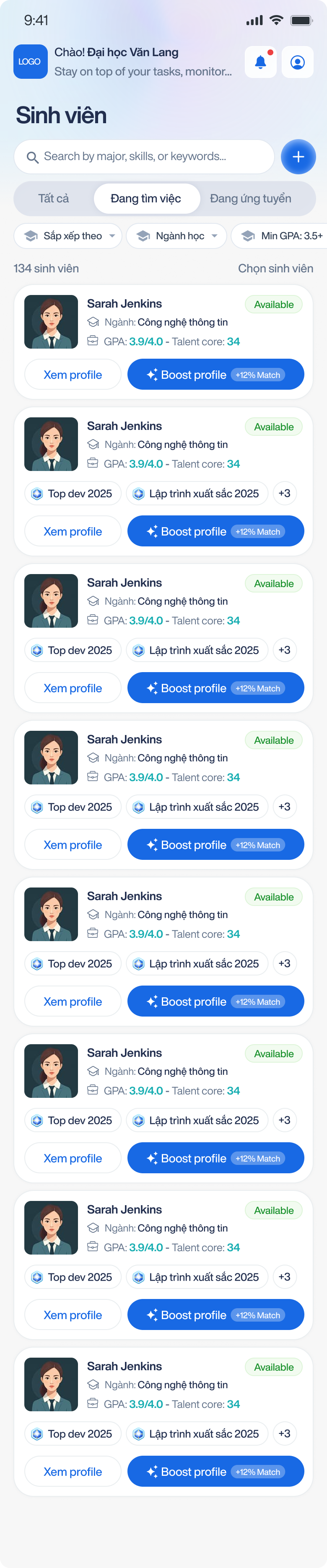 Nhanh chóng tìm đúng ứng viên bằng bộ lọc theo ngành, GPA, năm tốt nghiệp và kỹ năng.